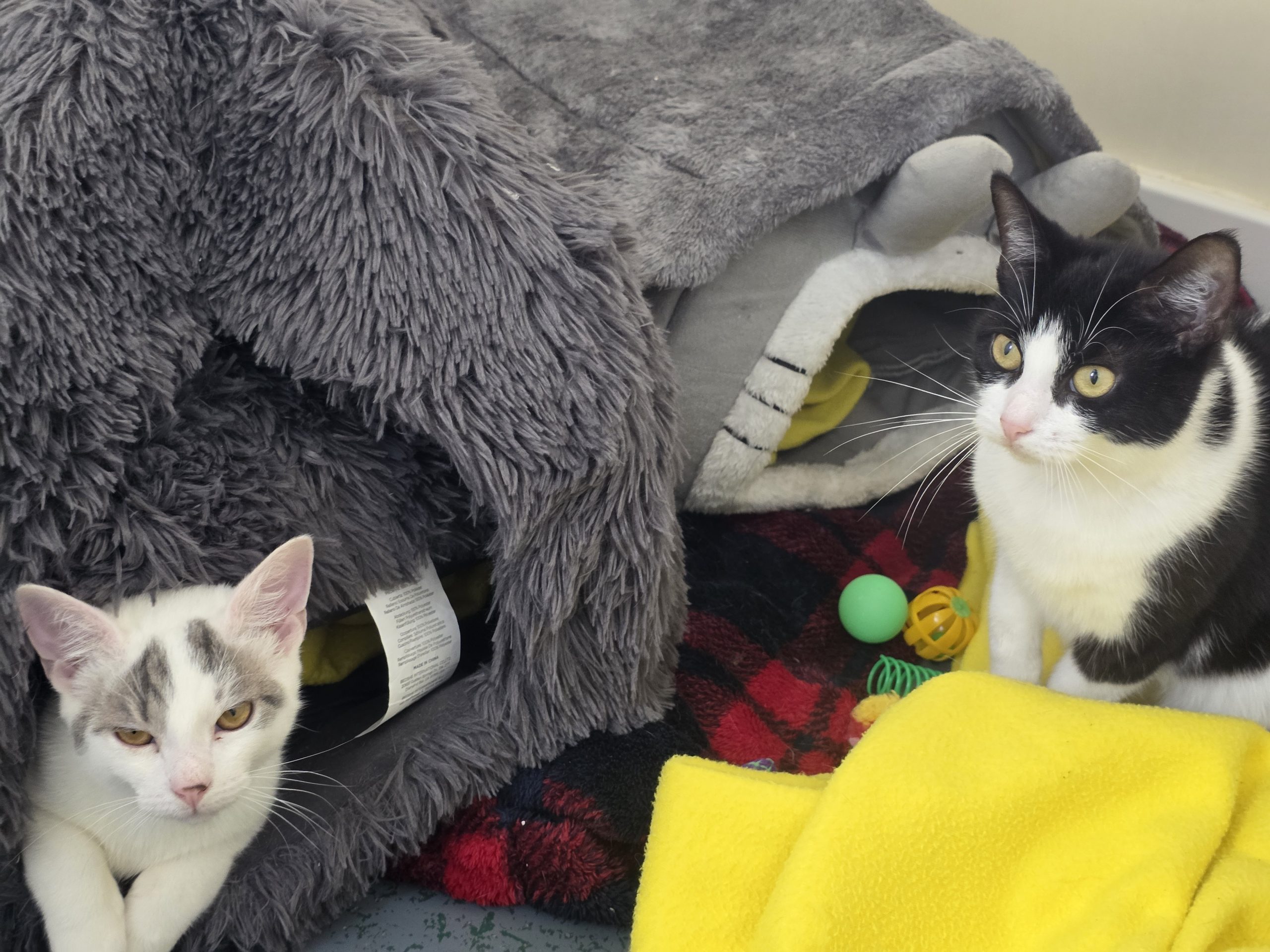 About me: Ruth (B&W) is a little shy and prefers her independence but does enjoy affection on her terms. She likes being outside and will even open doors and windows to fulfil her adventurous side! She loves to be up high and enjoys scratching posts. Dingo (G&W) is a very friendly and playful youngster who loves affection and will seek out your lap. He likes to chase shadows and his tail when he gets excited.