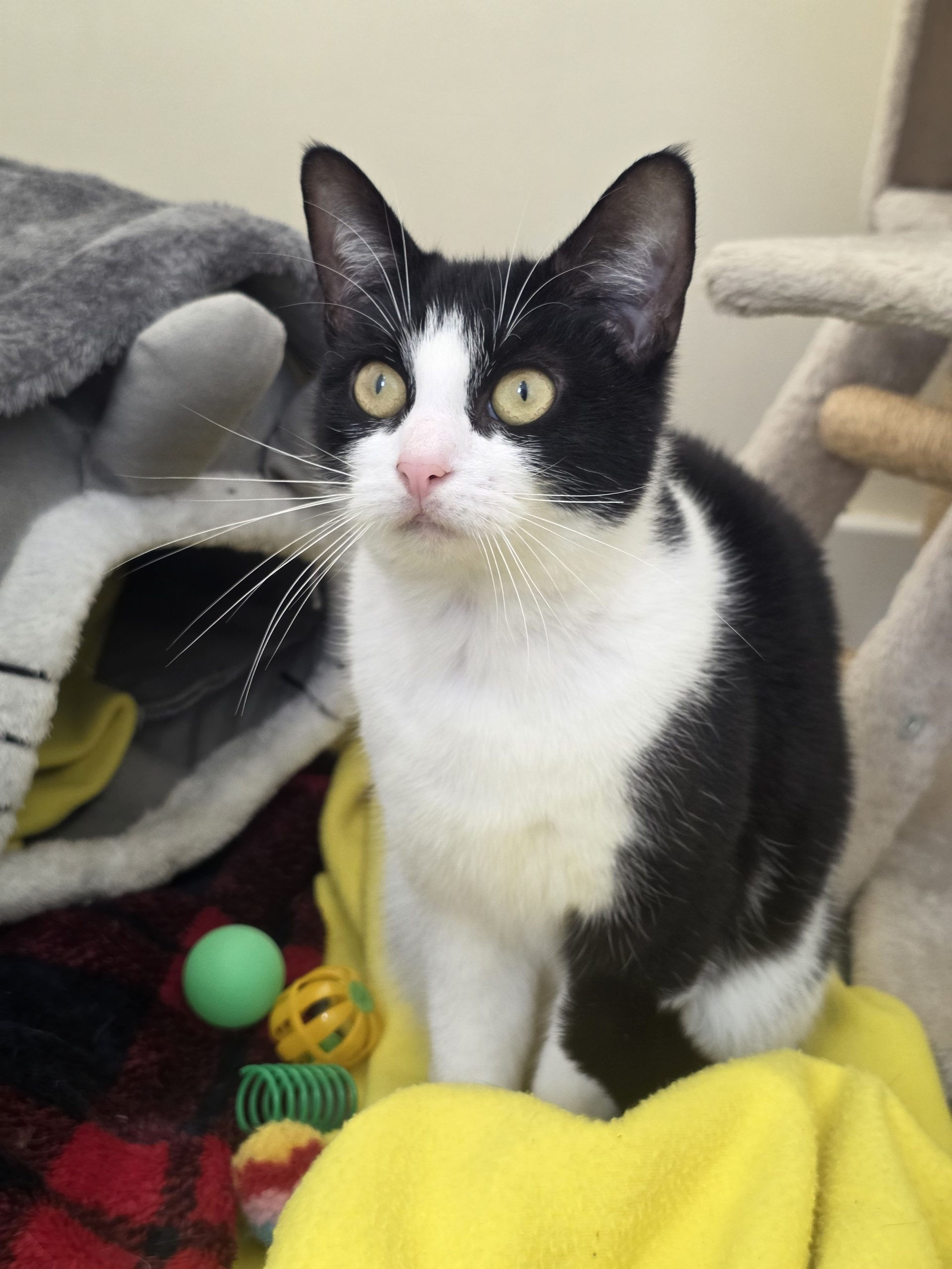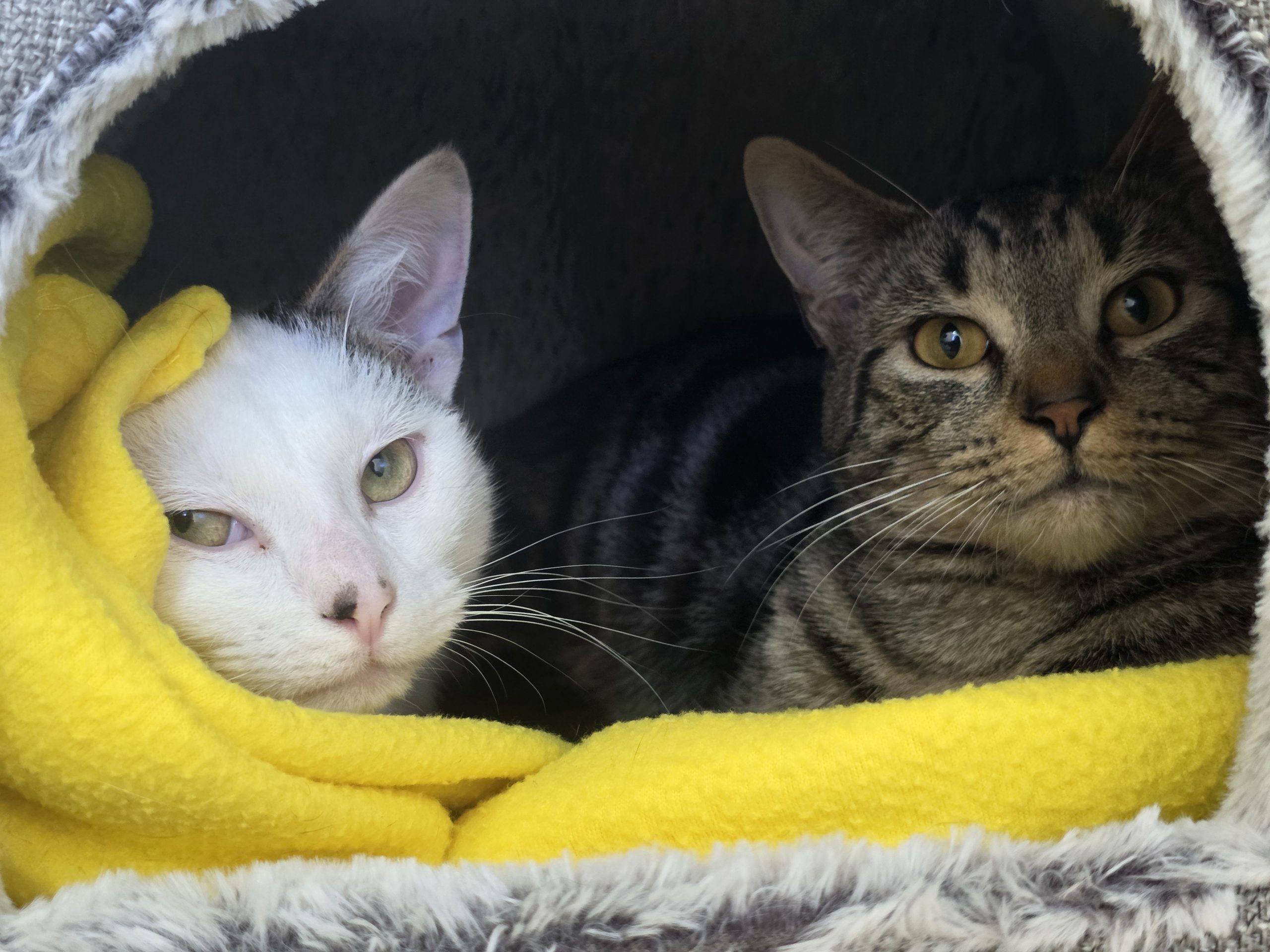 About me: Hamilton (T&W) and Ozzy (Tabby) can be timid at first but once settled, they are very affectionate. Ozzy loves cuddles and will fully embrace sleeping on you. They are both playful – Hamilton especially loves a fluffy mouse toy.